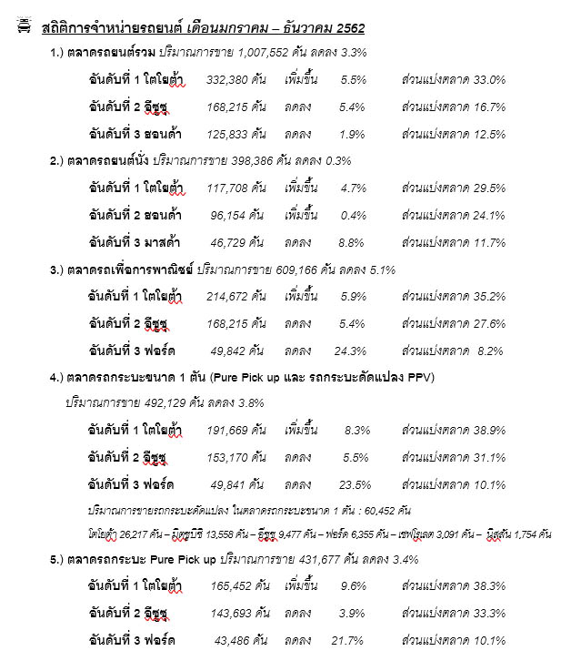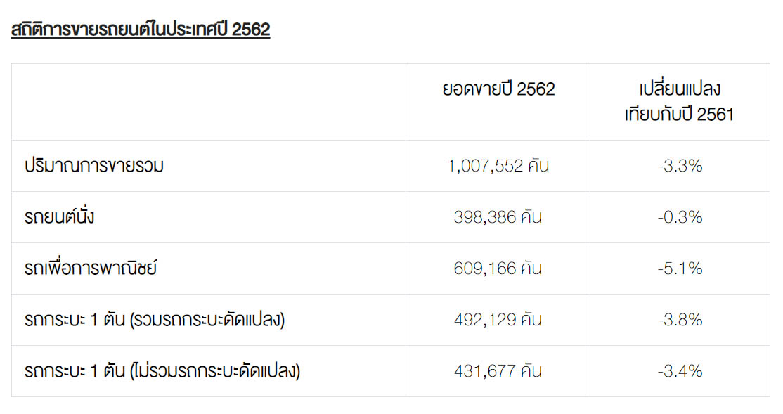 “ยอดขายรถยนต์รวมในประเทศไทยปี 2562 ลดลง 3% โดยมียอดขายอยู่ที่ 1,007,552 คัน แต่อย่างไรก็ตามครั้งนี้ยังถือได้ว่าเป็นครั้งที่สี่ในประวัติศาสตร์ของตลาดรถยนต์ไทยที่มียอดขายถึงระดับหนึ่งล้านคัน ถึงแม้ว่าตลาดรถยนต์มีการหดตัวอย่างเห็นได้ชัดในช่วงครึ่งปีหลัง โดยเฉพาะอย่างยิ่งนับตั้งแต่เดือนกันยายนผ่านมา”