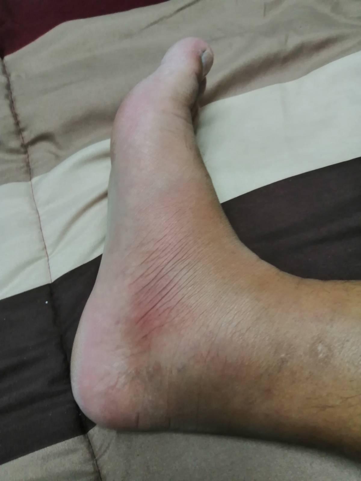 เมื่อไม่กี่วันก่อน เท้าซ้ายพลิกครับ ก็เลยไปโรงพยาบาล คุณหมอ x ray ดู ก็บอกว่า ไม่มีหัก แล้วก็ไม่หลวมมาก ให้ใส่เฝือกอ่อน และห้ามลงน้ำหนัก 1 อาทิตย์ ตอนนี้ผ่านมาประมาณ 4 วัน ยังมีอาการปวดบริเวณ สีแดง ลง