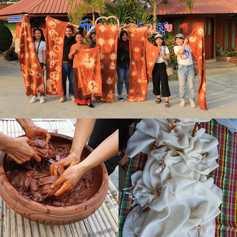 พวกเราได้มีโอกาสลองทำผ้ามัดย้อมที่มีผืนเดียวในโลก ด้วยการทดลองทำลวดลายเองอีกด้วยค่ะ แม้ว่าหน้าตาจะออกมาไม่สวยงามเหมือนอย่างที่ชาวบ้านทำ แต่เราก็ภูมิใจในผลงานของพวกเราทุกคนค่า 555 และสำหรับคนที่ทำเองไม่สวยอย่างเราก็สามารถใช้เงินแก้ปัญหาด้วยการอุดหนุนสินค้ามัดย้อมดินภูเขาไฟได้เลยค่ะ มีทั้งเสื้อ ผ้าพันคอ หมวกสวยๆ ราคาไม่แพงเลยค่ะ