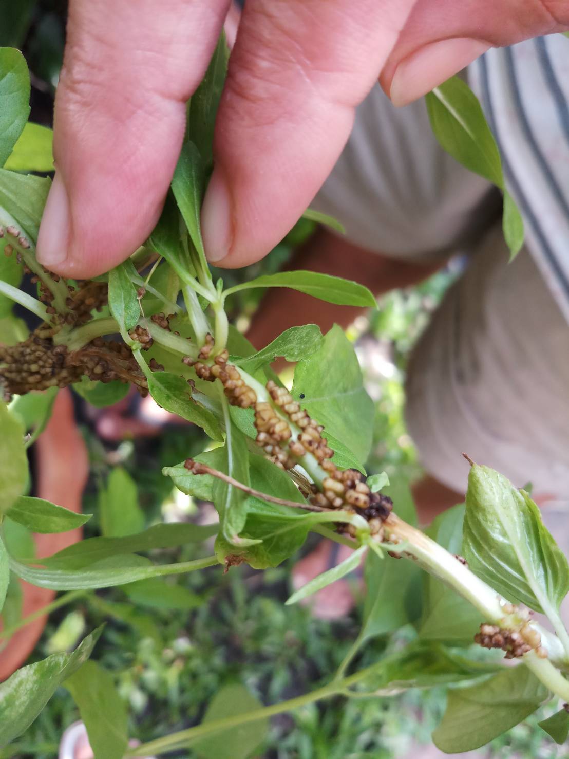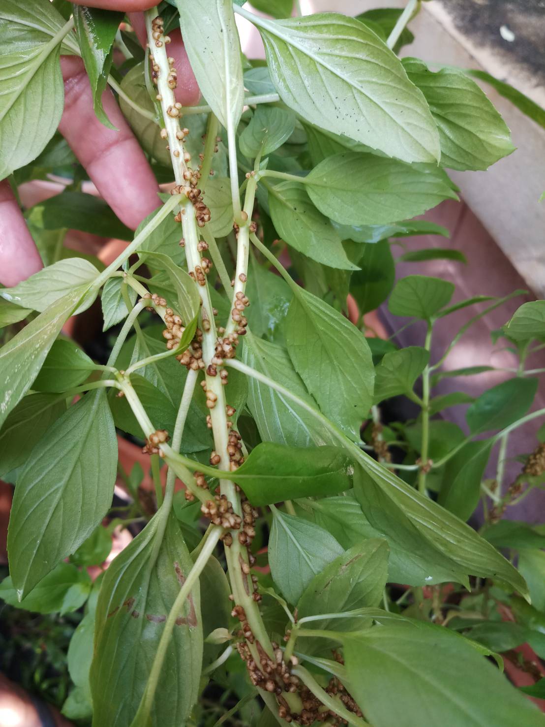 เพื่อนฝากถามค่ะ สมุนไพรเจตมูลเพลิง ปลูกในกระถาง เป็นขาวๆที่ยอดแบบนี้ อยากทราบว่านี่เป็นเรื่องปกติหรือว่า เป็นโรคหรือแมลงอะไรมาทำลายคะ และหากเป็นโรคหรือแมลง ควรต