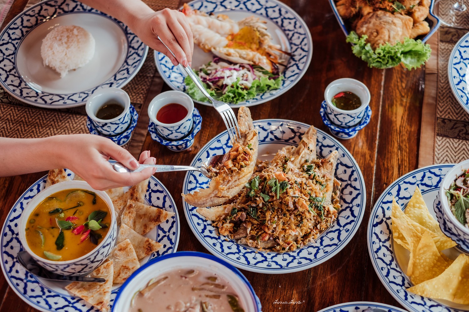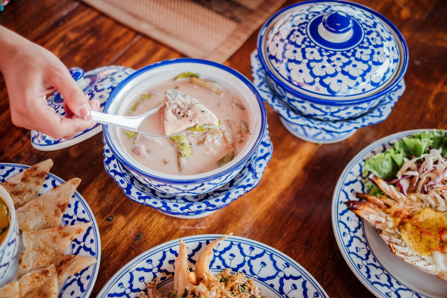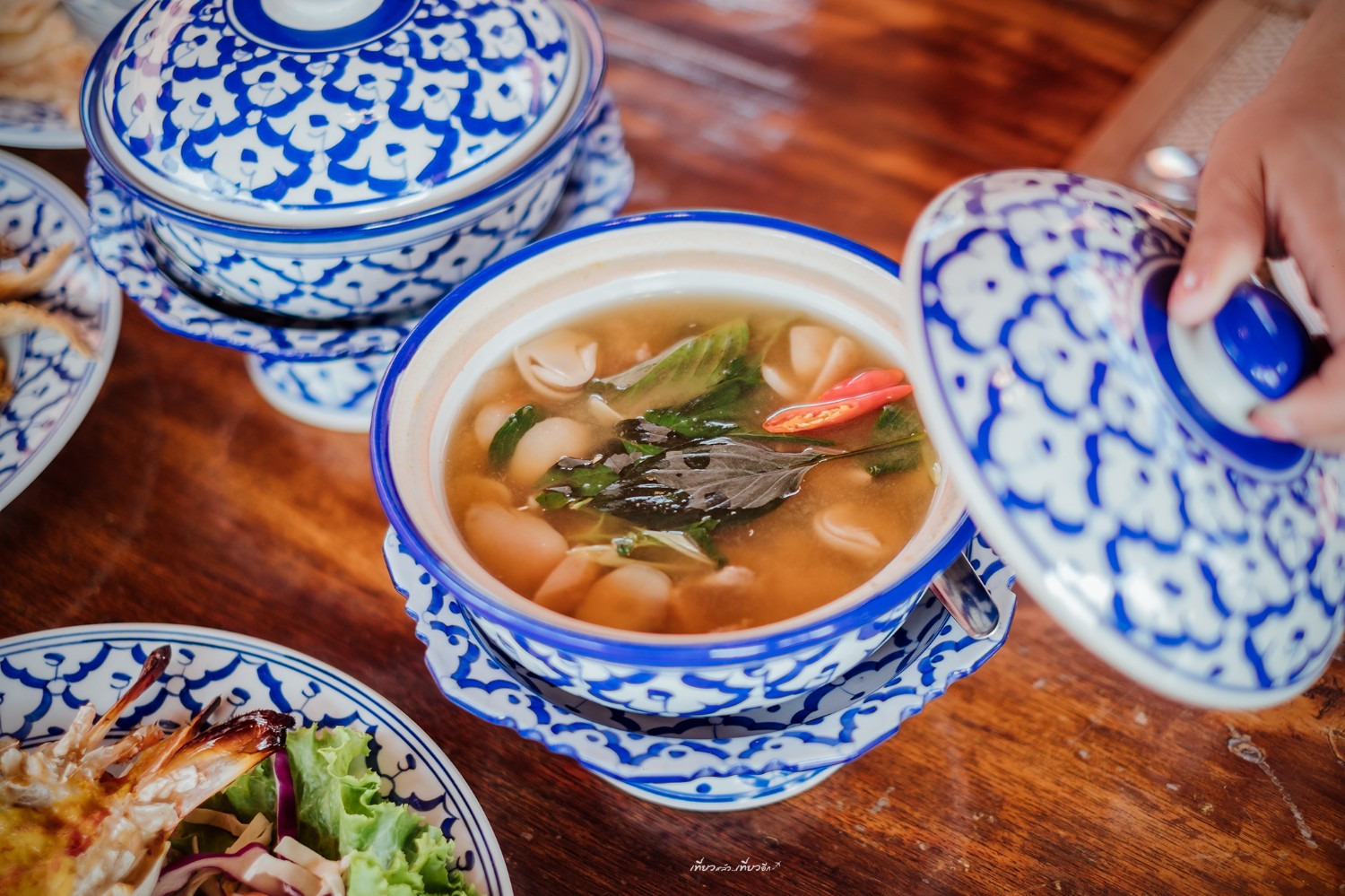 หลากหลายเมนูอาหารของเรือนรับขวัญ ใช้ภาชนะลายคราม สวยงาม และการจัดจานที่ดูดี สวยมากๆ