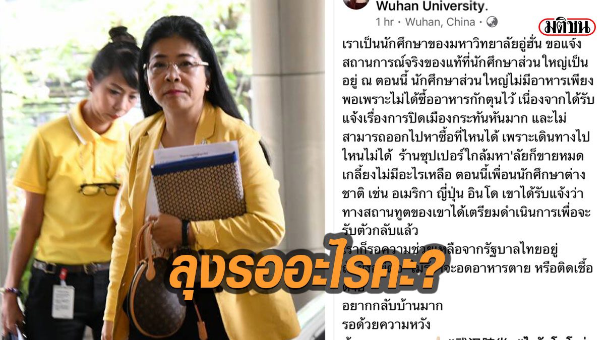“นศ.ไทยในจีน ขอกลับบ้านด่วน..!! สถานะการณ์ตอนนี้ทั้งอดอาหาร ทั้งกลัวติดเชื้อโคโรน่าไวรัส ประเทศอื่นเขาดำเนินการรับคนของเขาแล้ว ส่วนประเทศไทย #ลุงจะรออะไรคะ ยิ่งเด็กติดอยู่ในพื้นที่นาน โอกาสติดเชื้อก็ยิ่งสูง ช่วยไรได้ก็รีบทำซะ คนจะได้เลิกบ่นว่า #รัฐบาลเฮงซวย เสียทีค่ะ” คุณหญิงสุดารัตน์ กล่าว