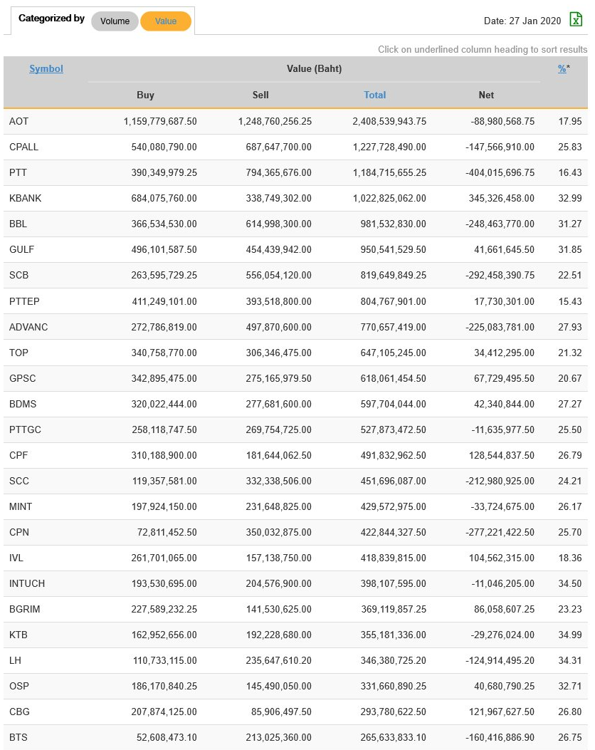 นักลงทุนต่างชาติ NVDR ซื้อ-ขาย มูลค่าสูงสุด 25 อันดับ 27/01/63