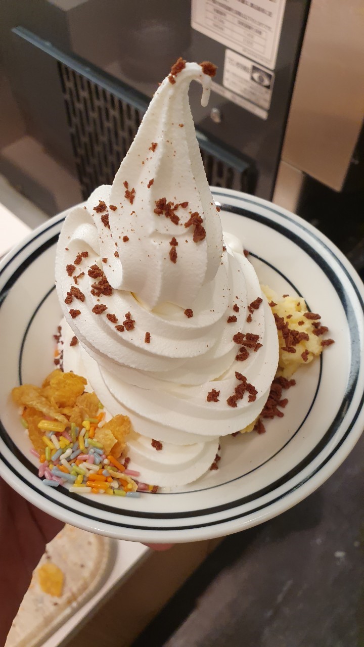 นอกจากนี้ยังมีซอฟท์ครีมให้กดได้ไม่อั้น พร้อมตกแต่งความสวยงามด้วยคอนเฟรค และเกล็ดน้ำตาลได้ตามใจชอบ