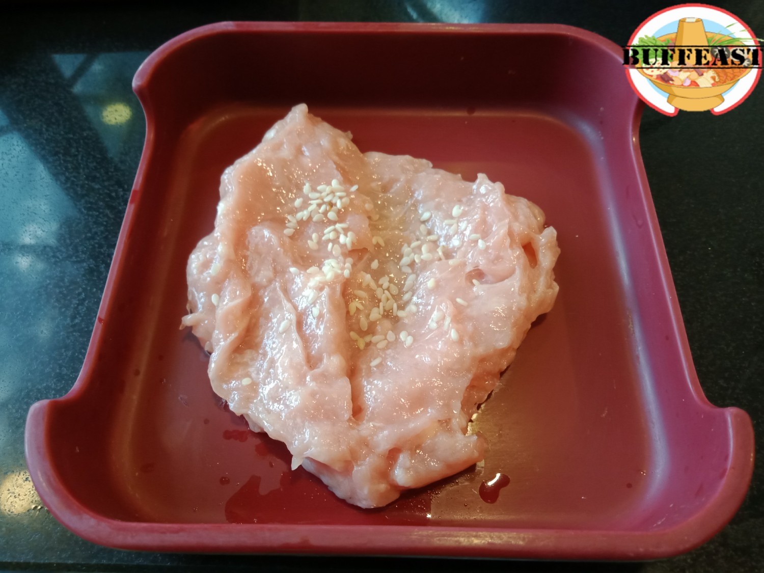 เนื้อหมูบด เนื้อเด้งนุ่ม รสหวานนิดๆ หอมงาที่หมักมาด้วย