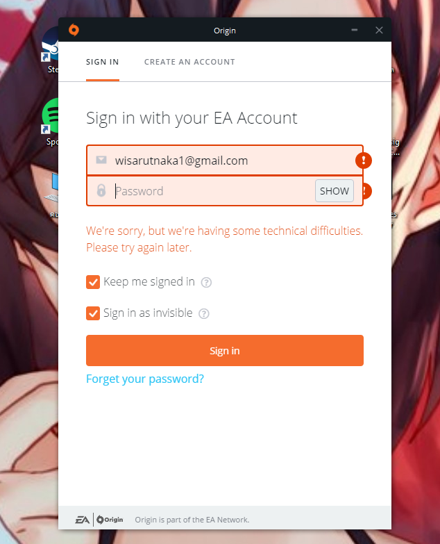 origin ล็อกอินไม่ได้ มันขึ้นว่า ขออภัย เรากำลังพบปัญหาขัดข้องทางเทคนิคบางอย่าง กรุณาลองใหม่อีกครั้งภายหลัง
