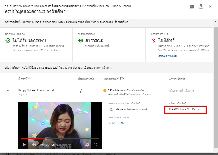ถามชาว Youtuber ค่ะโดน haawk for a 3rd party ลิขสิทธิ์เพลงช่วงสั้นๆ มันคืออะไรคะ เเล้วต้องทำยังไง?