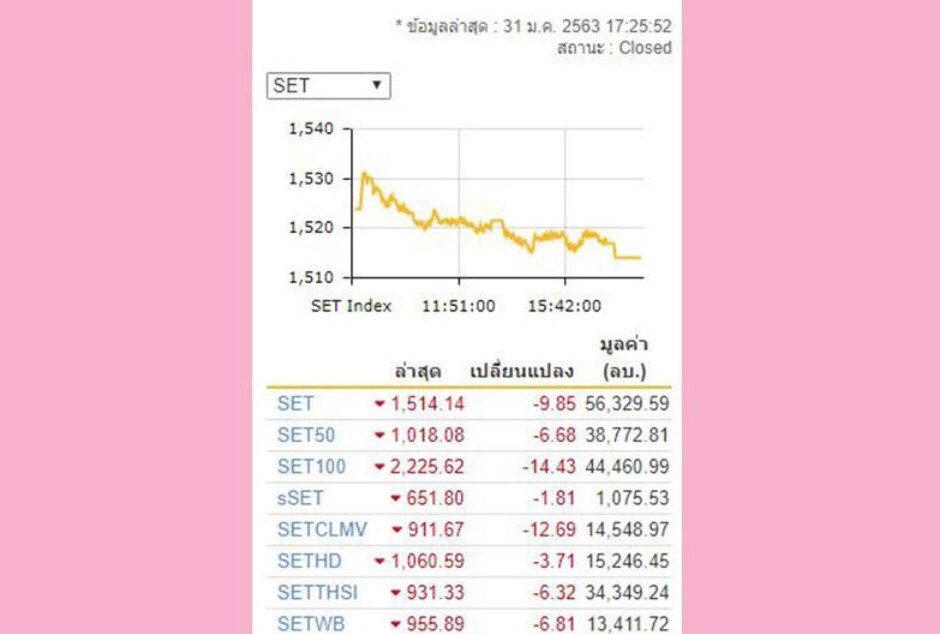 หุ้นไทยปิดลบ 9.85 จุด ตามตลาดหุ้นในภูมิภาคที่ปิดร่วง กังวลการแพร่ระบาดไวรัสโคโรนา หลังพบผู้ติดเชื้อมากถึง 9,800คน