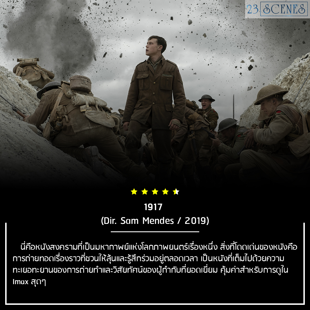 สิ่งที่โดดเด่นของหนังคือมันเป็นหนังที่ถูกถ่ายทำแบบ long take ซึ่งนอกจากจะทำให้เราได้รับประสบการณ์ในการรับชมขั้นสูงสุดสำหรับการดูหนังในโรงภาพยนตร์ ตัวหนังยังแสดงออกให้เห็นถึงความทะเยอะทะยานและวิสัยทัศน์อันยอดเยี่ยมของผู้กำกับ การถ่ายหนัง long take อาจจะมีเกิดขึ้นเยอะแยะมาแล้วในโลกภาพยนตร์ แต่ในแวดวงของหนังสงคราม มันไม่ได้มีให้เห็นบ่อยๆ หากจะเปรียบเทียบง่ายๆ ครั้งหนึ่งเราเคยตื่นตาตื่นใจกับหนังสงครามอย่าง Dunkirk ที่พาคนดูทะยานเข้าสู่สถานการณ์ของสงครามทั้ง 3 สถานที่ บนบก ทะเล และท้องฟ้า แต่ในขณะเดียวกัน มันไม่ได้ทำให้ผู้ชมร่วมอยู่ในเหตุการณ์มากเท่ากับ 1917 ที่เรารู้สึกเป็นส่วนหนึ่งของมัน และยิ่งพอมันถูกถ่ายทำแบบนี้ มันเลยแสดงให้เห็นว่าผู้กำกับเหนือชั้นขนาดไหน ที่กำกับทุกสิ่งทุกอย่างในสเกลระดับมหากาพย์ได้