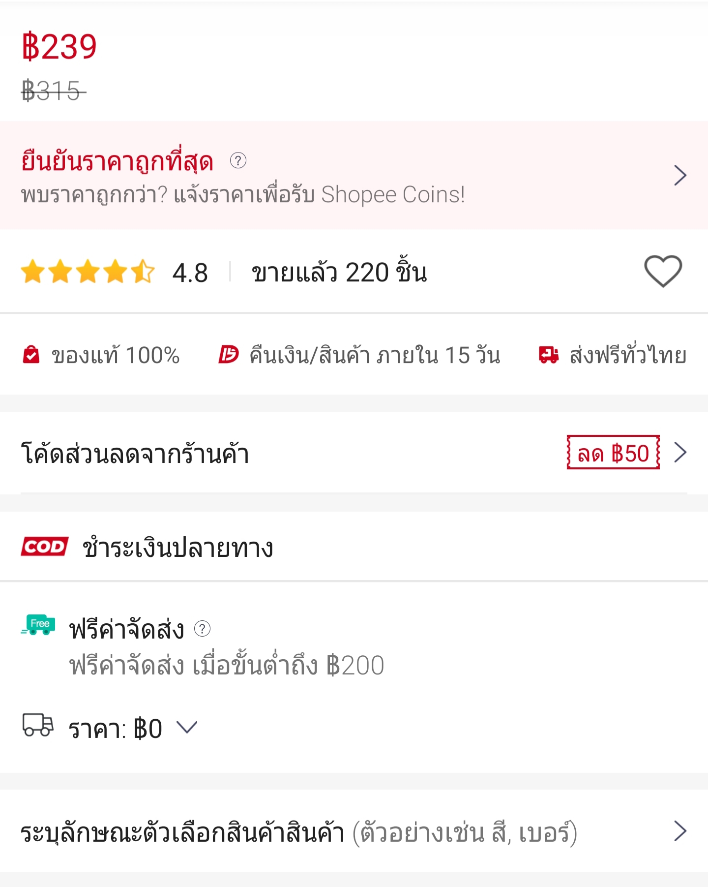 อย่างอันนี้ผมจะสั่งของราคา 239 บาท และตรงค่าส่งมีแจ้งชัดเจนว่าฟรีค่าส่งเมื่อซื้อ 200 บาทขึ้นไป