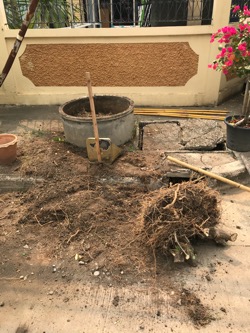 กระถางใหญ่ไซส์ 60cm ปลูกต้นเดิมมาปีกว่ารากฝอยทั่วกระถาง ถอนแล้วค่ะใช้พลั่วขุดตักดินเก่าทิ้งมาหลายวันยังไม่เสร็จ คนมาส่งต้นไม้ใหม่จ้างขุดแต่ขุดไปคืบนึงเค้าบอกพี่ลงต้นใหม่ได้เลยรากฝอยมันไม่เป็นอะไร ไม่ร