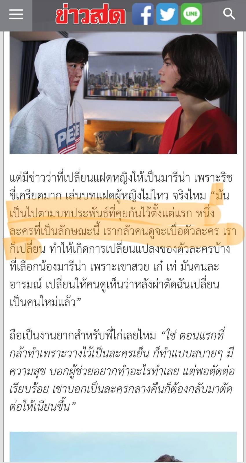 ตอนแรกเจ๊บอกริชชี่เล่นดีมาก ที่เปลี่ยนตัวนางเอก เพราะคาแรคเตอร์โตขึ้น และกลัวคนดูเบื่อ แต่มาวันนี้บอกว่าริชชี่เล่นไม่โอเค จนต้องใช้การตัดต่อช่วย