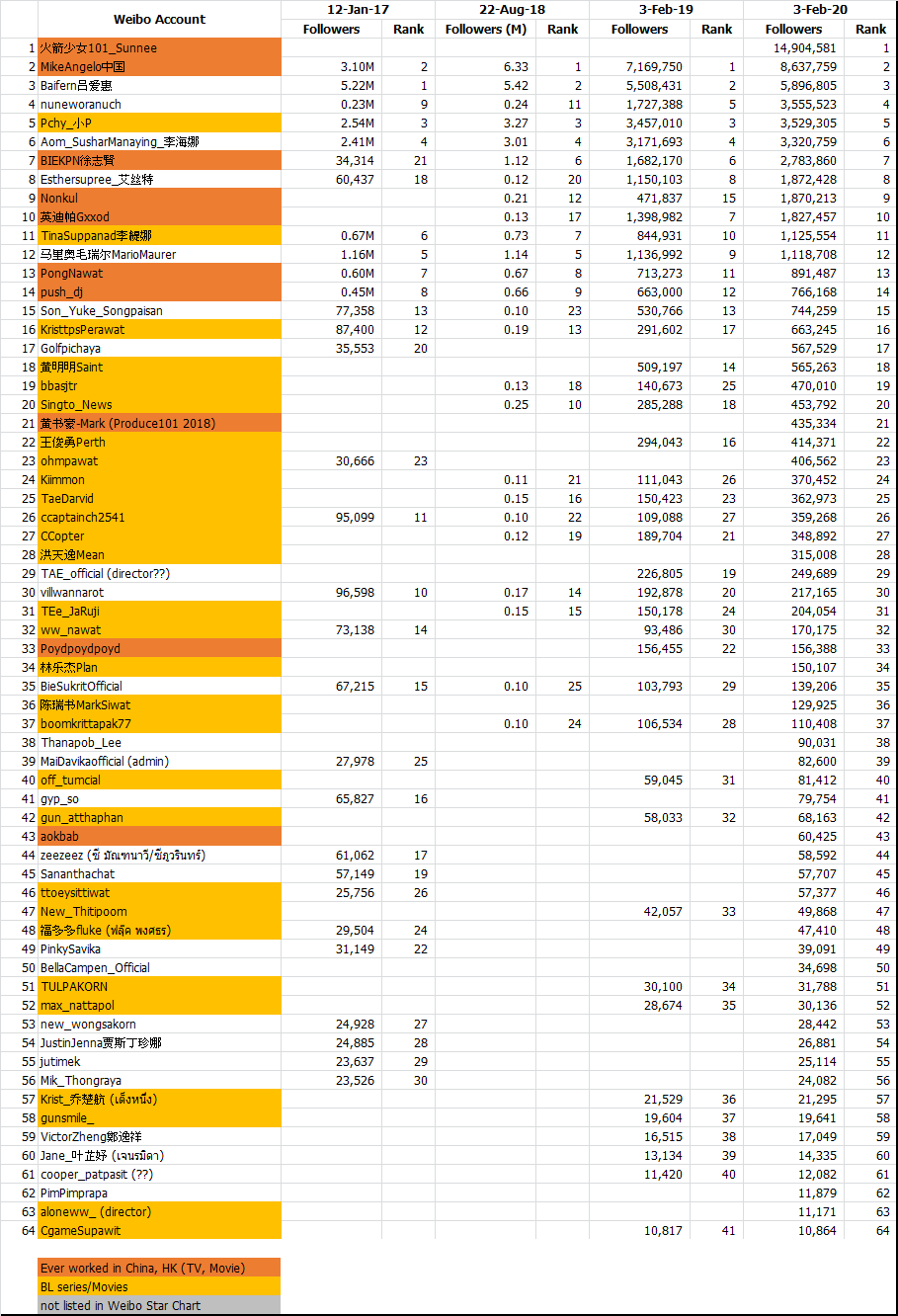 ยอด Followers ดารานักแสดงไทยที่ Weibo อัพเดท 3ก.พ.2563