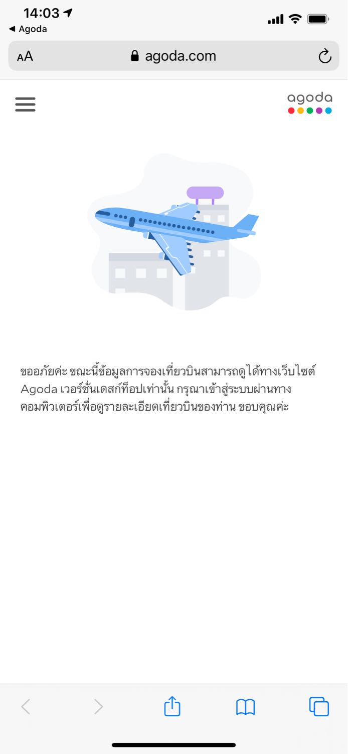 พอดีจองตั๋วเครื่องบินผ่าน agoda แล้วลืมแคปหมายเลขการจองไว้ พอจะเช็คสถานะการจอง มันให้เปิดเข้าไปดูในคอม อยากทราบว่าต้องกดตรงไหน เพราะคลิกเข้าไปที่"การจองของฉัน"แล้วมันไม่มีบอกเลยอ่ะค่ะ ตอนนี