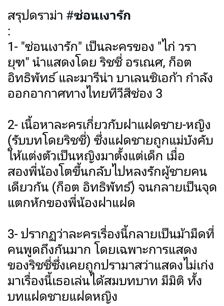 เรื่องละครซ่อนเงารัก แฟนละครเราบ่นเรื่องบทมันห่วย ไม่สมจริง และการ continue ของตัวละครหลัง EP9 เราจะไม่ขอพูดถึงการแสดงของน้อง M กันนะคะ เราพูดเรื่องผู้จัด บทละคร และการกำกับ การบรี๊ฟตัวละครให้ออกมาเป็นที่วิจารณ์ในทางลบใน EP หลังๆ