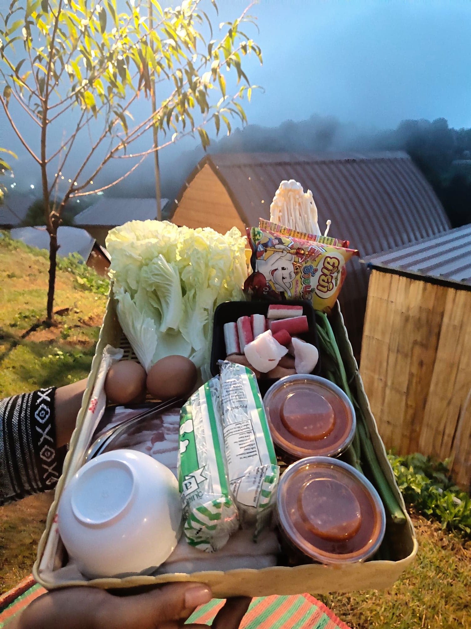 และนี่คือซิกเนเจอร์ของการเที่ยวภูเขา ชุดนี้400 บาทนะคะท่านผู้ชม กินอิ่มแล้วก็นอนพัก กับบรรยากาศดีๆ หมอกเย็นๆ