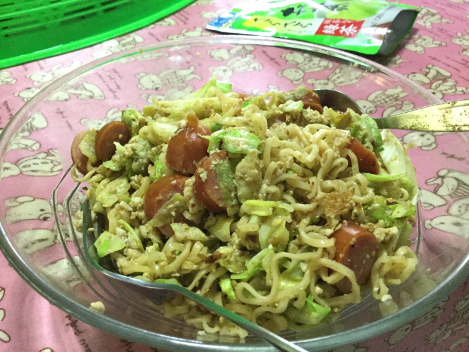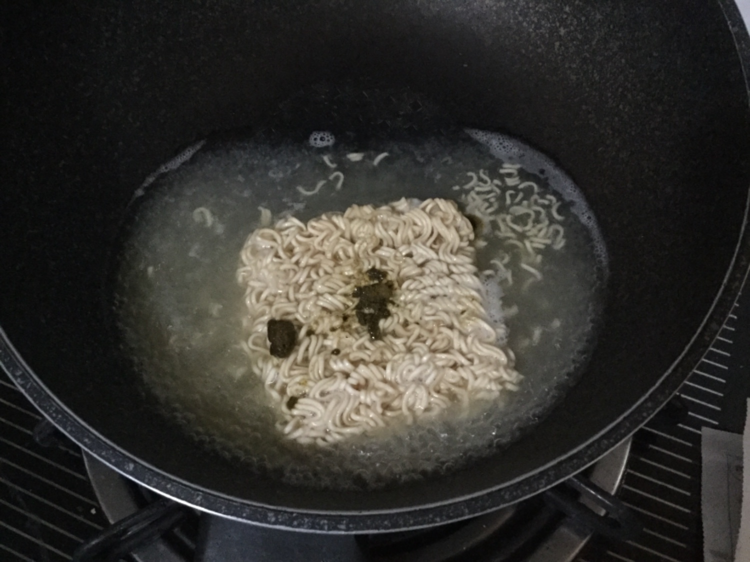 ต้มมาม่า และใส่ผงชาเขียวลงไป ที่เป็นก้อนๆเขียวๆนั่นล่ะค่ะ เสร็จแล้วแยกน้ำออก เก็บน้ำซุปซดเล่นหรือจะทิ้งไปก็ได้ค่ะ