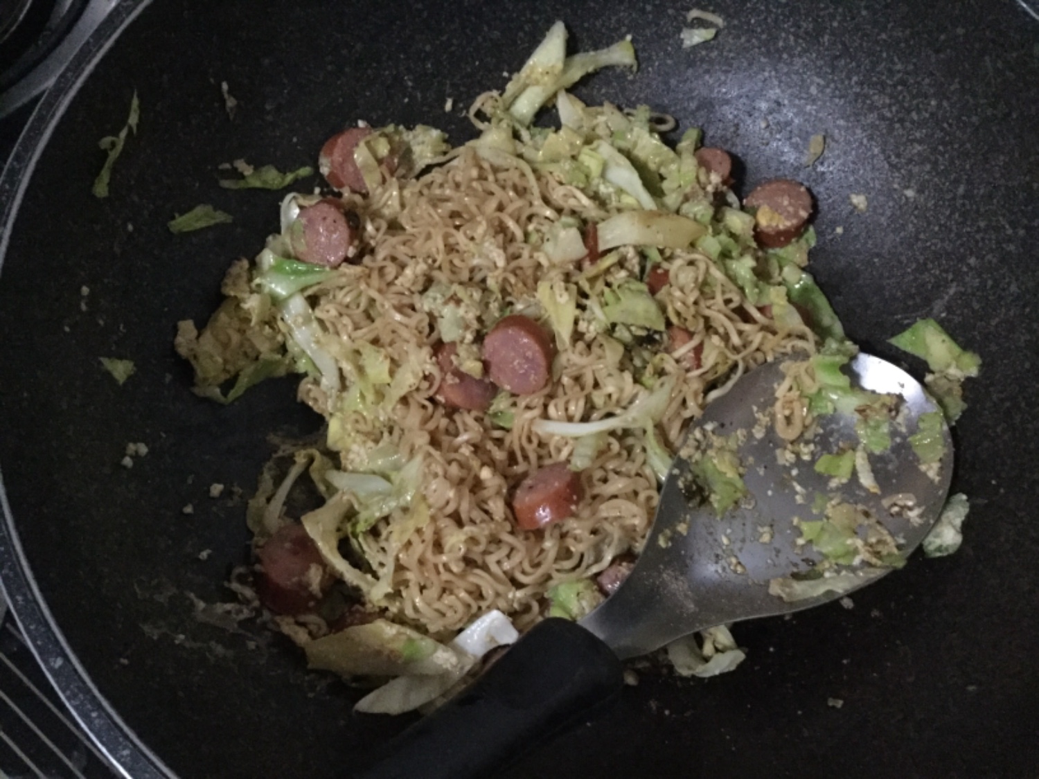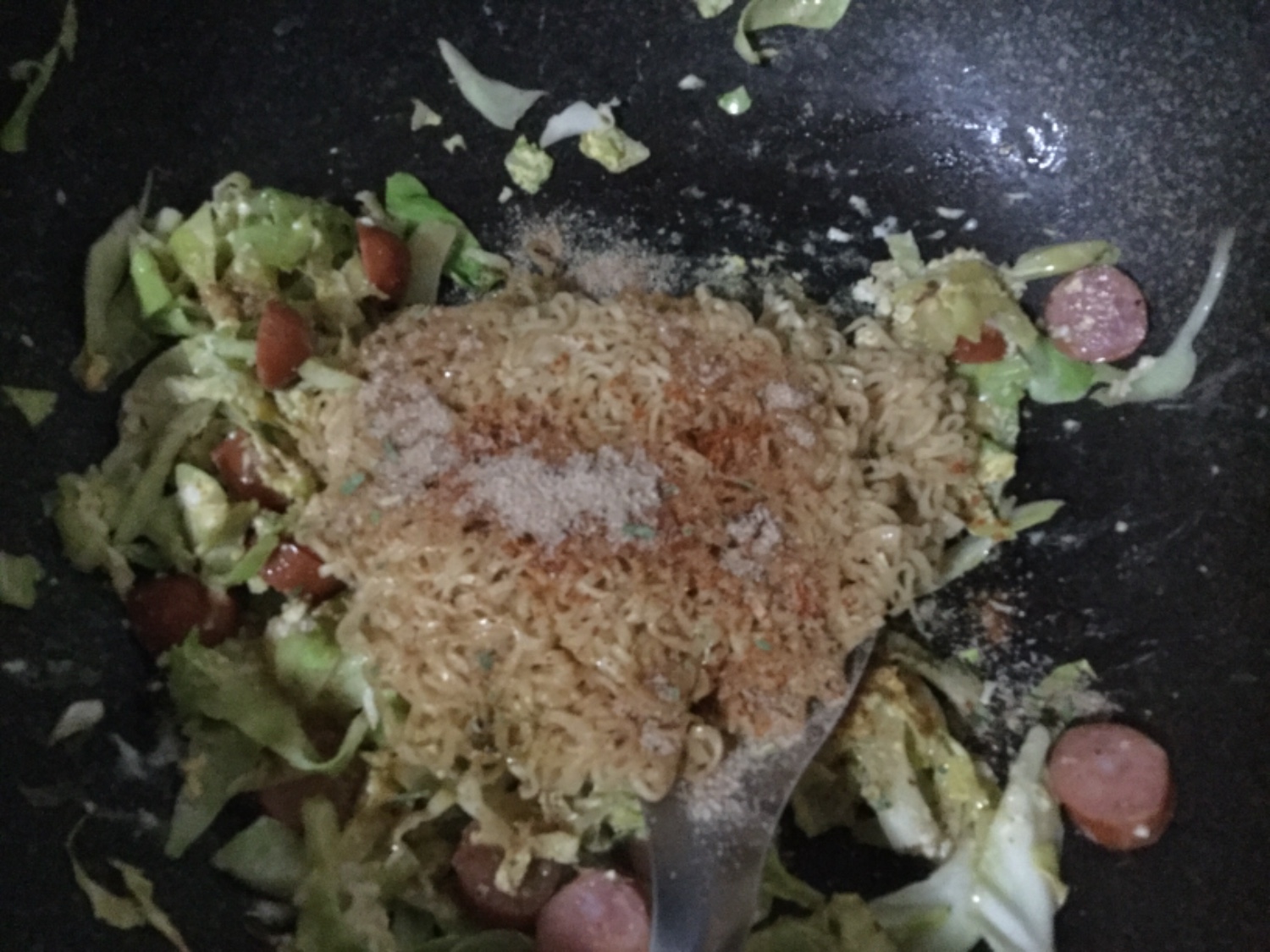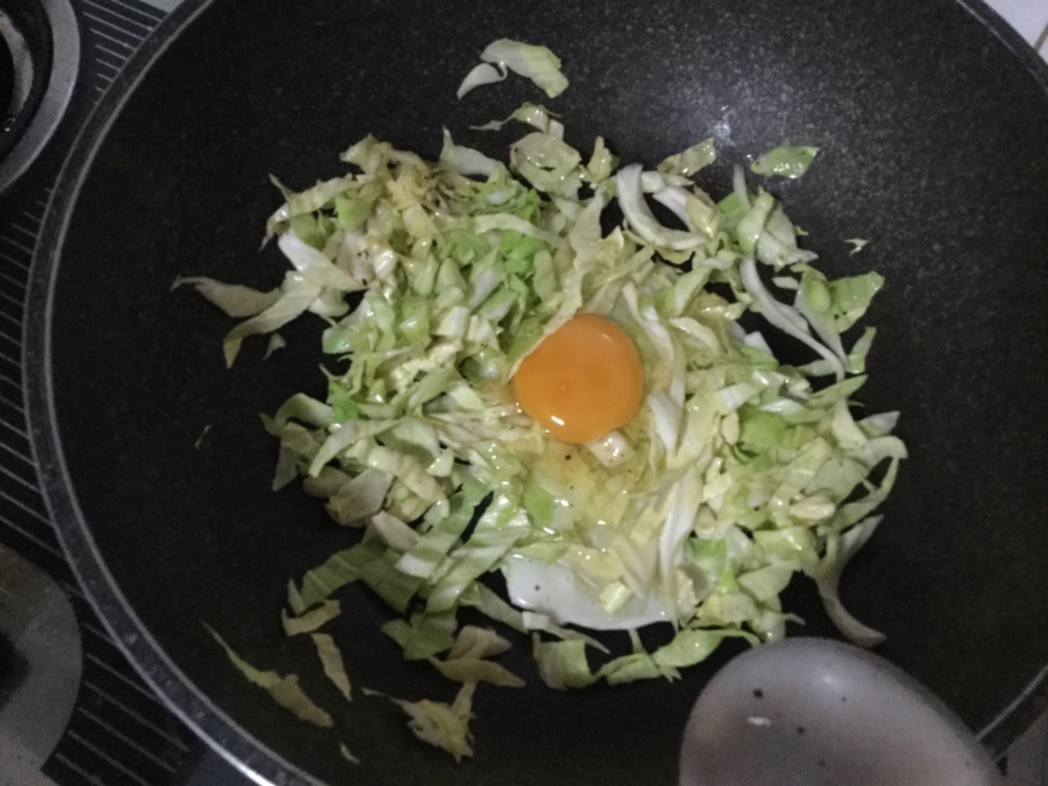 ใส่น้ำมันกระเทียมเจียว กะหล่ำปลี และไข่ไก่