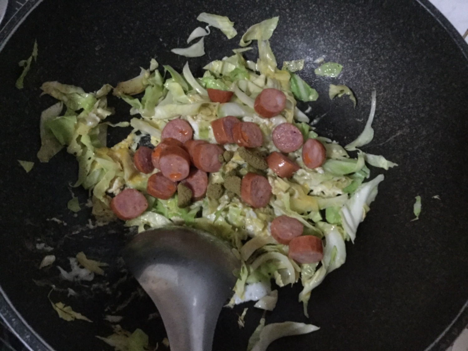 ผัดผักให้สุก และใส่ไส้กรอกกับผงชาเขียว