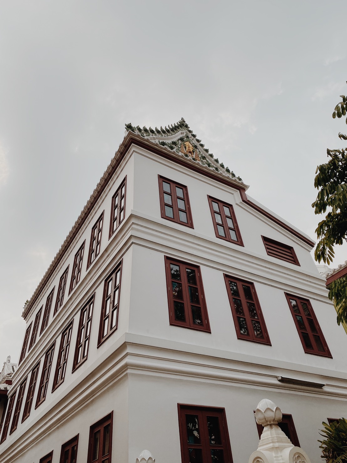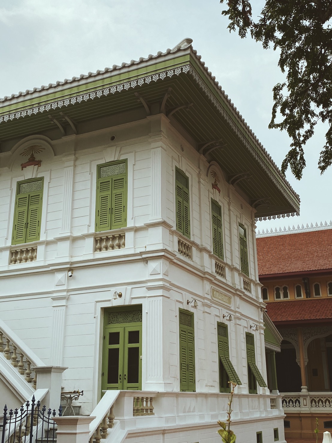 และหลังคาสีเขียวใบเตยดูสบายตา กับตึกสีขาวอีกหลังที่มีกรอบไม้หน้าต่างสีน้ำตาล,