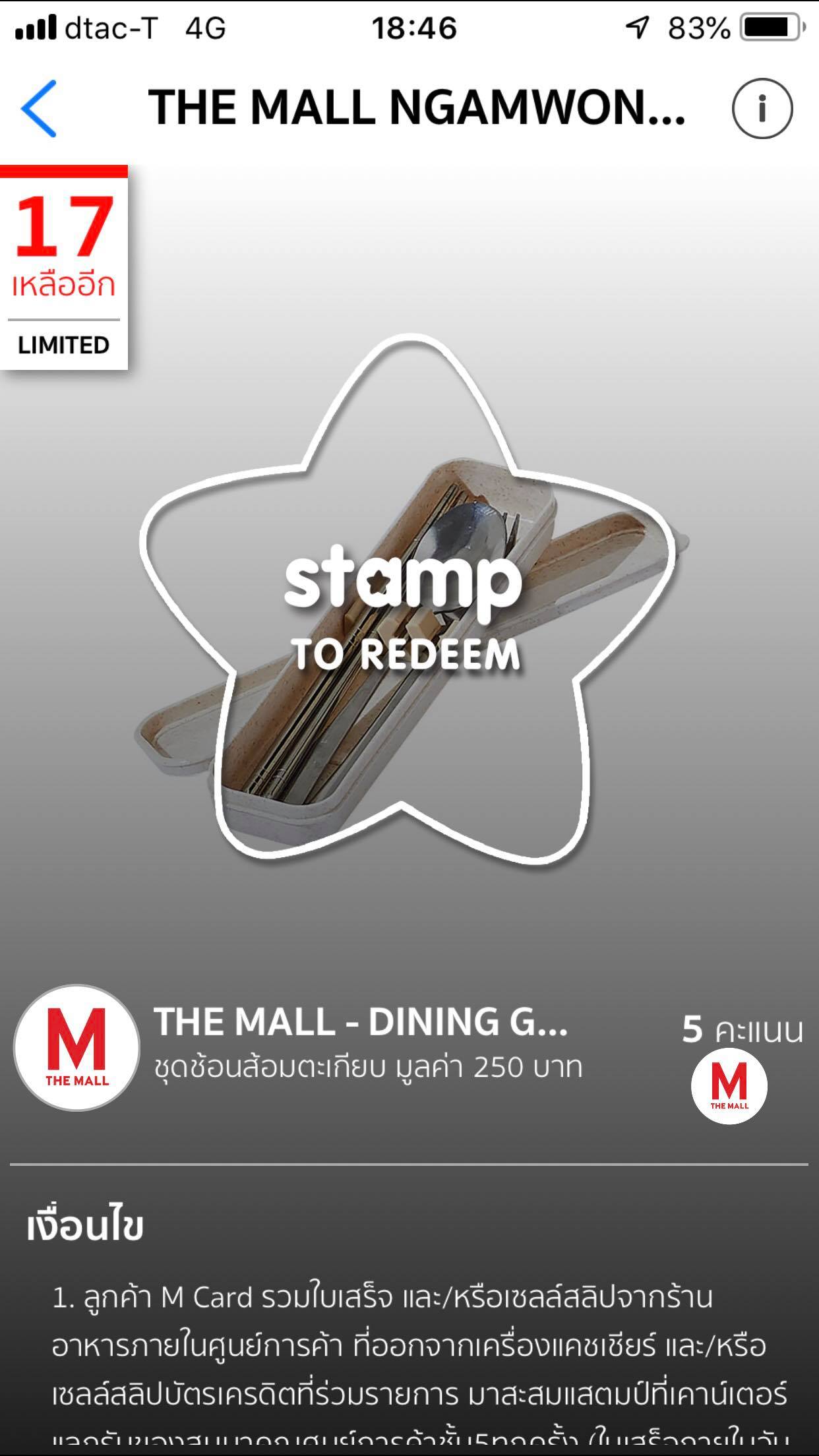 จากรูปจะเห็นว่า จขกท. มีอยู๋ 7 คะแนน ซึ่งสะสมครบ 5 คะแนน จะแลกช้อนส้อมได้ เมื่อกดเข้าไปก็เห็นว่ายังมีสิทธิ์เหลือ 17 สิทธิ์