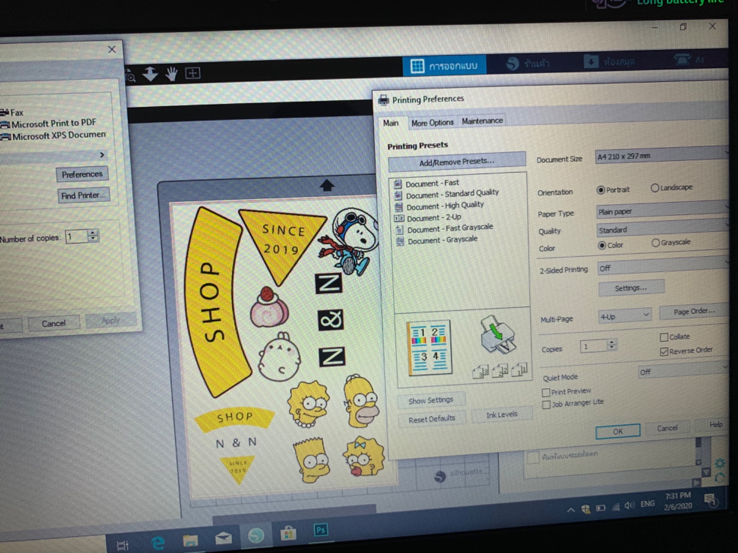 สั่งให้เครื่องปริ้นรูปออกมาขนาดหนึ่งหน้ากระดาษเอสี่สั่งปริ้นผ่านโปรแกรมphotoshop แต่เครื่องปริ้นออกมาให้เป็นเอสี่สองแผ่นแผ่นละครึ่งรูปและรูปมีขนาดใหญ่มากค่ะ ลองเปลี่ยนโปรแกรมเป็นปริ้นผ่านโปรแดรมเครื่องตัด ได้ออกมาเป็นรูปเล็กค่ะตอนแรกปริ้นได้ปกติค่ะ