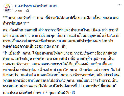 กกท. เผยวันที่ 11 ก.พ. นี้น่าจะได้ข้อสรุปเรื่องการเลือกตั้งนายกสมาคมกีฬาฟุตบอลฯ