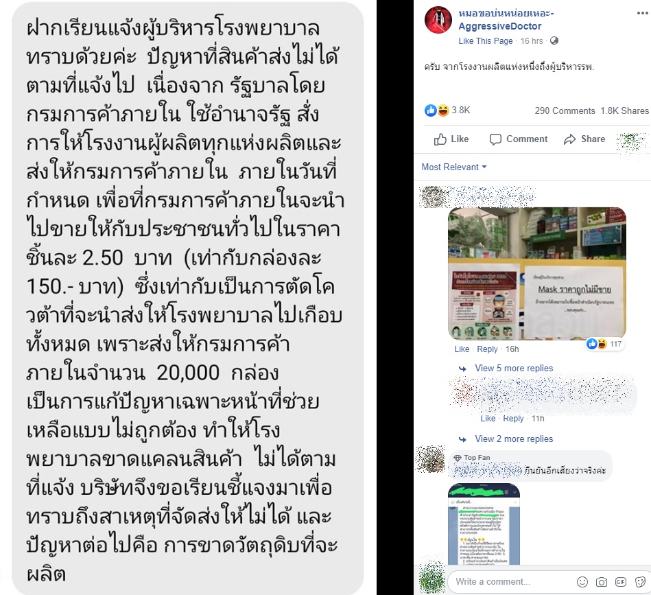 ฝากเรียนแจ้งผู้บริหารโรงพยาบาล ปัญหาที่สินค้าส่งไม่ได้ตามที่แจ้งไป เนื่องจากรัฐบาล โดยกรมการค้าภายในใช้อำนาจรัฐ สั่งการให้โรงงานผู้ผลิตทุกแห่งผลิตหน้ากากอนามัย ส่งให้กรมการค้าภายใน ภายในวันที่กำหนด เพื่อที่กรมการค้าภายในจะนำไปขายให้กับประชาชนทั่วไป ซึ่งเท่ากับเป็นการตัดโควตาที่จะนำส่งโรงพยาบาลไปเกือบทั้งหมด เป็นการแก้ปัญหาเฉพาะหน้าที่ช่วยเหลือไม่ถูกต้อง ทำให้โรงพยาบาลขาดแคลนสินค้า