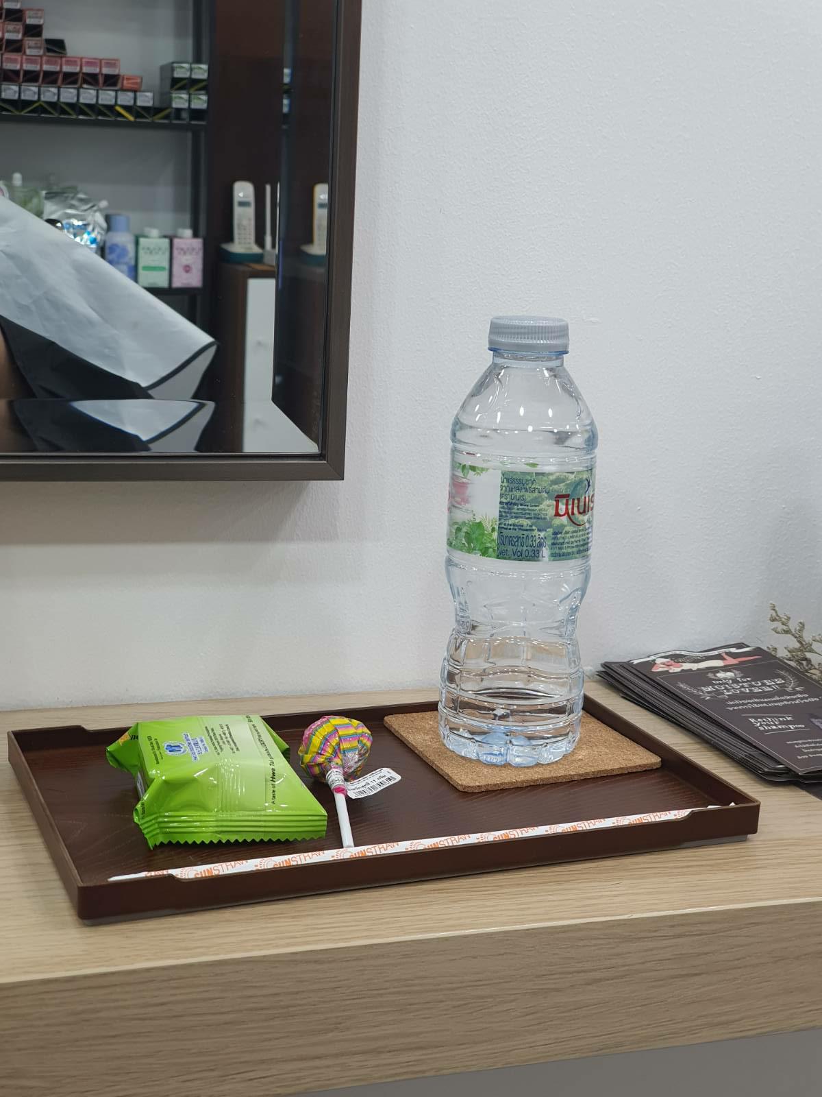 นอกเหนือจากผลิตภัณฑ์จะดีแล้ว ความใส่ใจเล็กๆน้อยๆอย่างน้ำกับขนมนิดหน่อยก็ได้ใจไปอีกเหมือนกันค่ะ เวลานอนสระผมก็จะมีผ้าห่มคลุมขา มีผ้าขนหนูปิดตากันน้ำกระเด็นให้ด้วย