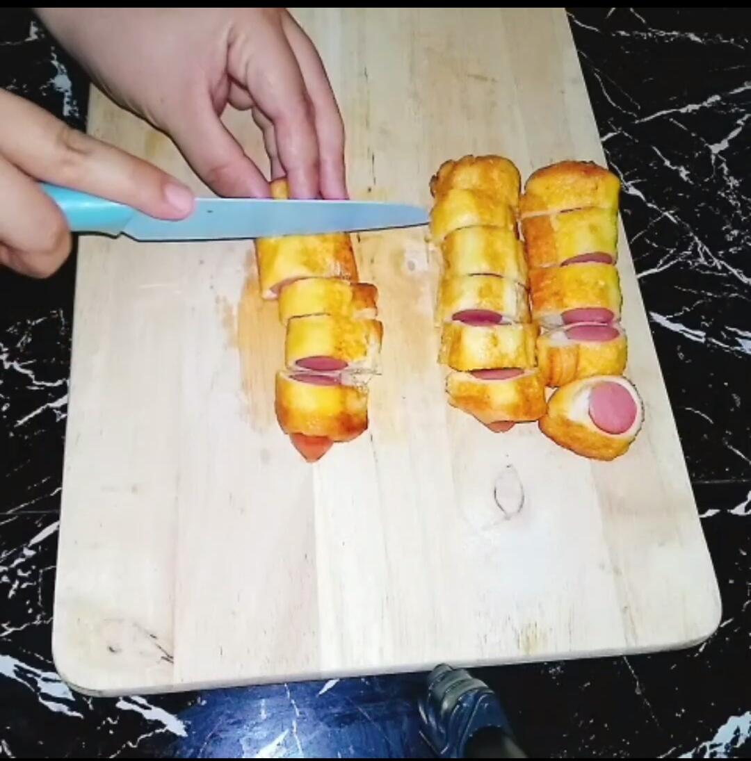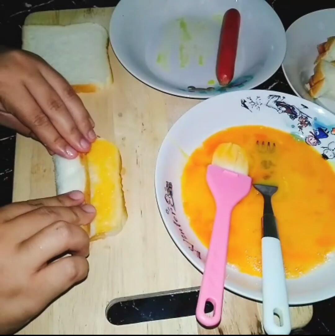 วางไส้กรอกบนขนมปังและม้วน ทาไข่ตรงขอบขนมปังและบีบขนมปังให้ติดกัน