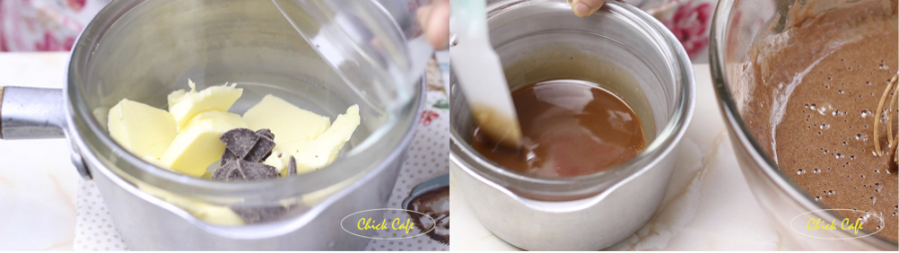 1 นำเนย เเละดาร์กช็อกโกเเลต ใส่ในชามเเละตั้งบนหม้อที่มีนํ้าร้อน ให้เนยละลาย