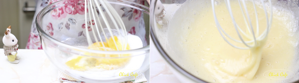 2 นำไข่ไก่ เเละนํ้าตาล ใส่ลงในอ่างผสมตีให้เข้ากัน โดยตีจนนํ้าตาลละลายจนหมด