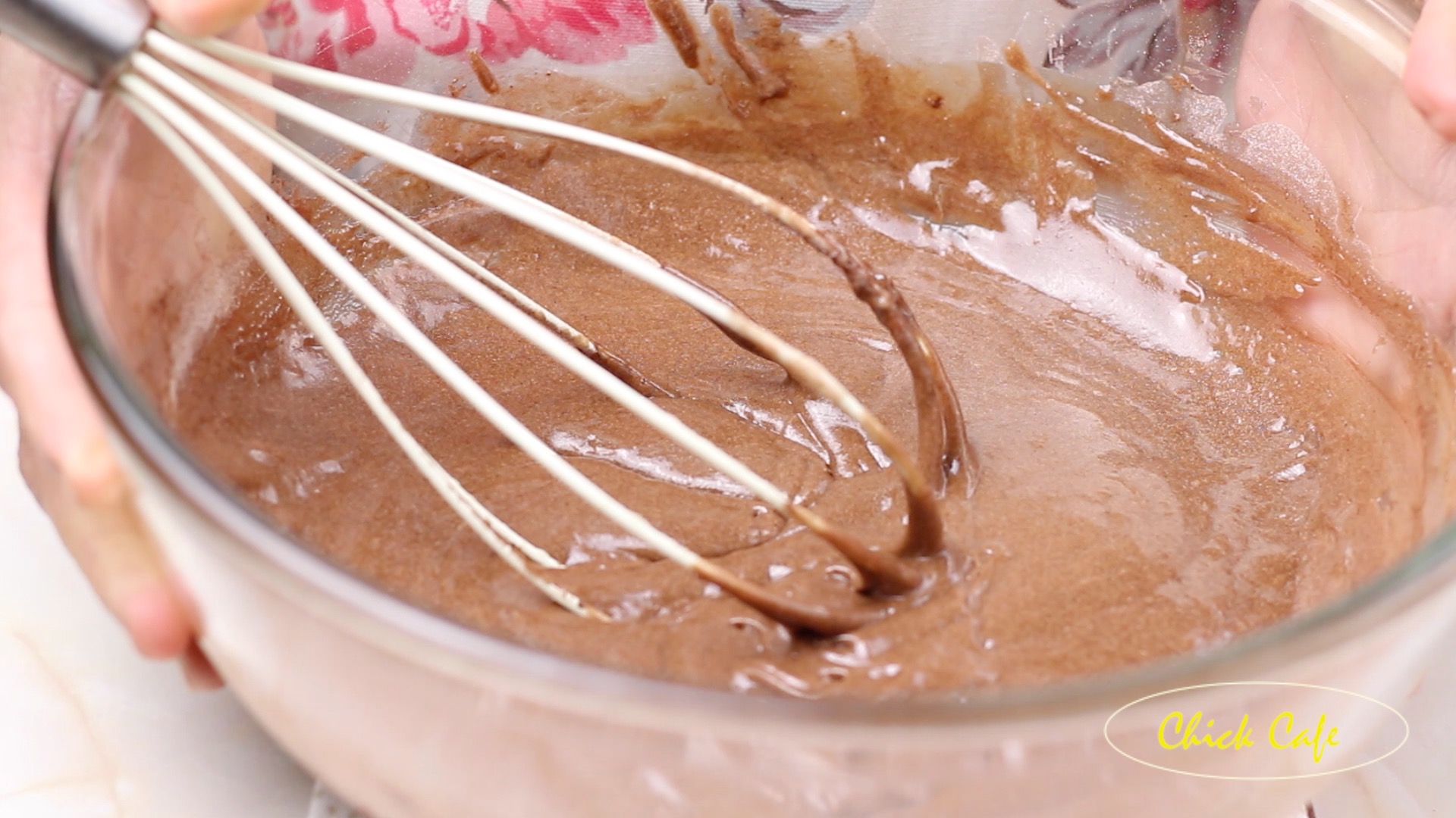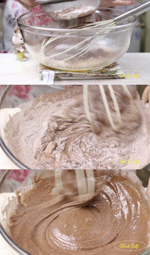 3 นำเเป้งอเนกประสงค์ ผงฟู เเละผงโกโก้ที่ร่อนเเล้ว ใส่ในอ่างผสมไข่ ตีให้พอเข้ากัน