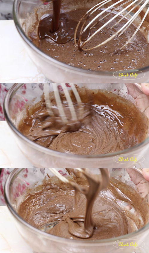 4 ใส่เนย เเละดาร์กช็อกโกเเลตที่ละลายเเล้ว ลงไปในอ่างผสมกับส่วนของไข่ ผสมให้เข้ากัน