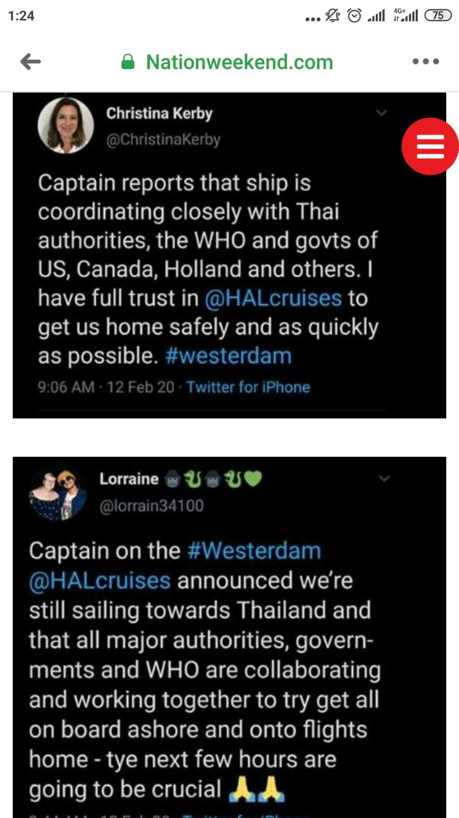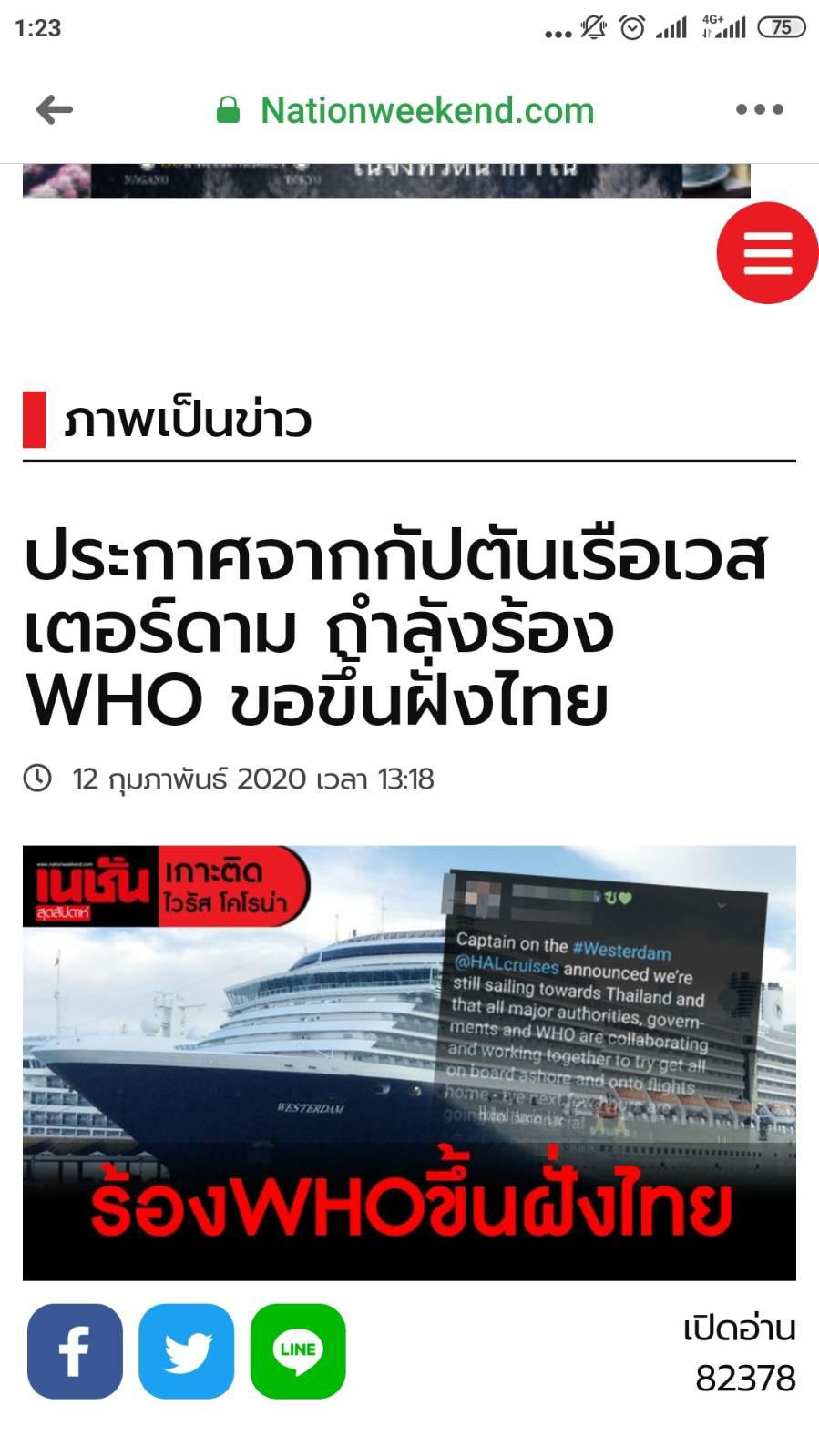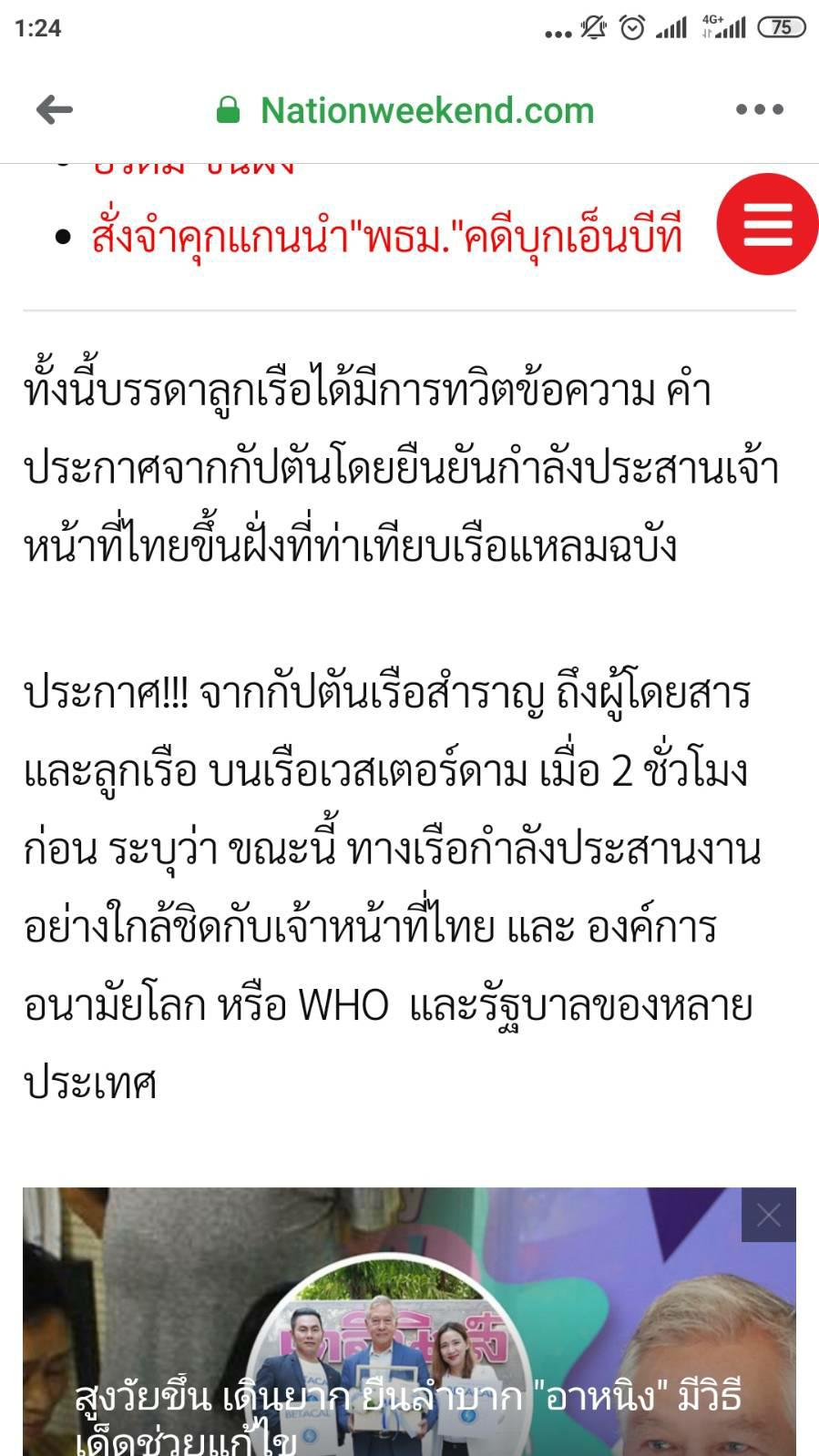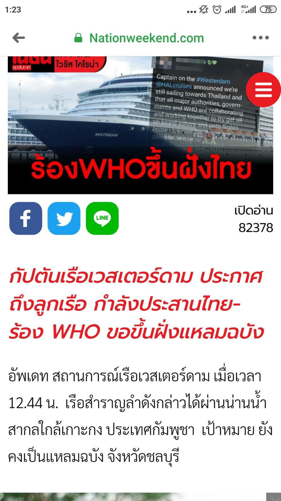 ประกาศจากกัปตันเรือเวสเตอร์ดาม กำลังร้อง WHO ขอขึ้นฝั่งไทย