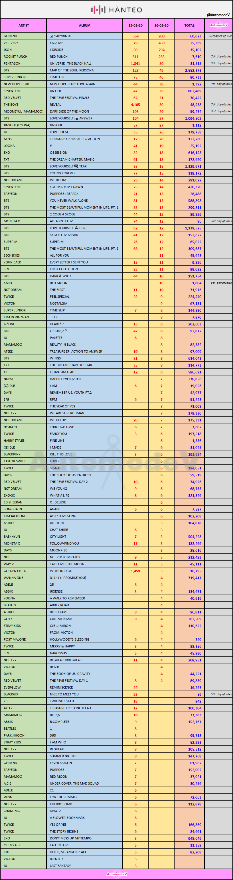 ยอดซื้ออัลบั้มจากชาร์ต HANTEO 15 -16 กุมภาพันธ์ 2563 + THE BOYZ & ROCKET PUNCH + 2020 1st DAY&WEEK