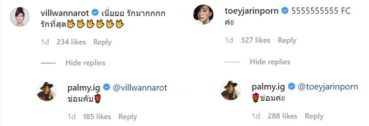 นอกจากจะตอบกลับความเห็นของ Marina แล้ว ปาล์มมี่ ก็ได้ขอบคุณคอมเมนต์ของ 2 นักแสดงอย่าง เต้ย-จรินทร์พร จุนเกียรติ และ วิว-วรรณรท สนธิไชย ที่มาเขียนแสดงความรู้สึกหลังดูคลิปอีกด้วย