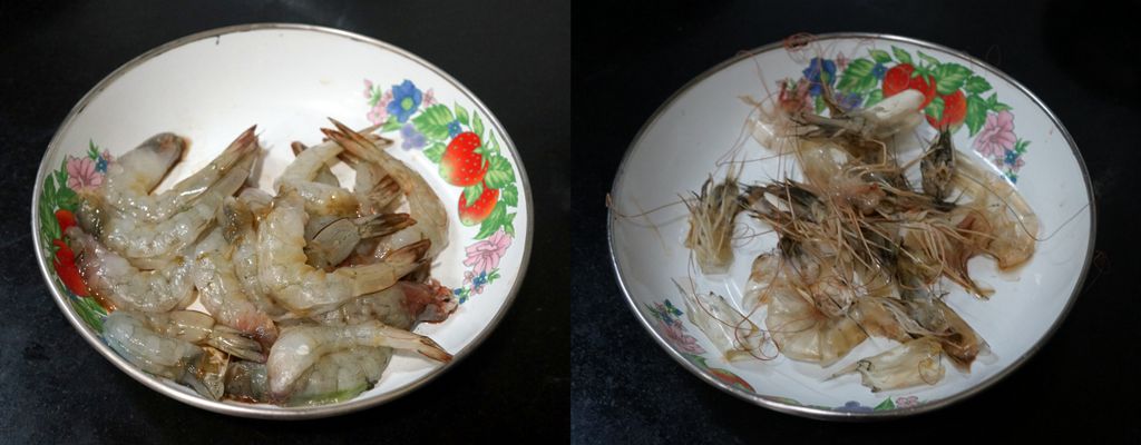 จัดการปอกกุ้ง เก็บหัวกุ้งไว้เพื่อผัดกับน้ำมัน จะได้น้ำมันที่มีรสกุ้ง หอมๆ