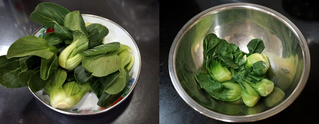 ผักกวางตุ้งไต้หวัน นำไปลวกน้ำร้อนให้สุก แล้วเช่ในน้ำเย็นทันที เพื่อให้ผักมีสีเขียวสวย นำผักไว้รองจาน