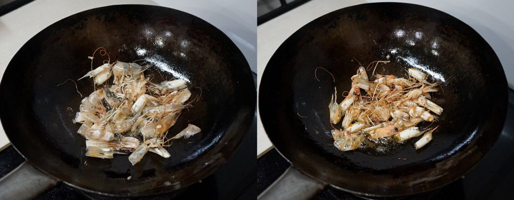 ตั้งกระทะให้ร้อน ใส่น้ำม้นลงไป พอน้ำมันร้อน ใส่หัวกุ้งลงไปผัด ผัดให้หอม ตักหัวกุ้งขึ้น