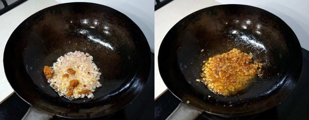 เอาหอมใหญ่ซอย 1 หัว ลงไปผัดกับน้ำมันกุ้ง จนหอมใหญ่สุก ใส่พริกแกงเผ็ดลงไป 1 ช้อนโต๊ะ ผัดให้เข้ากัน