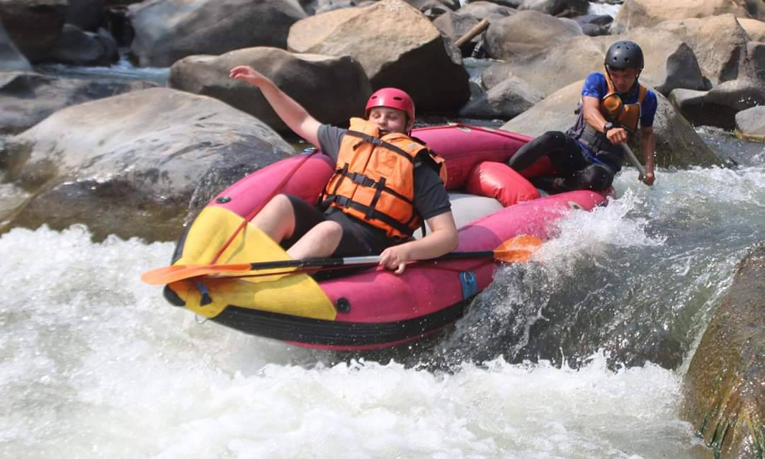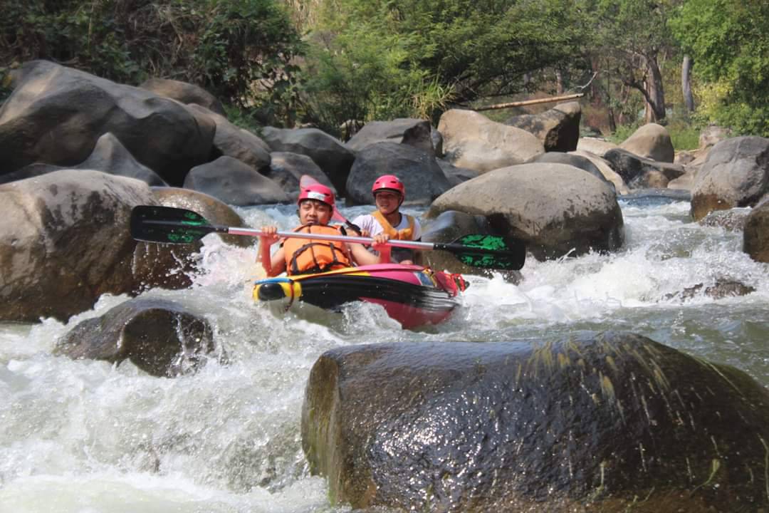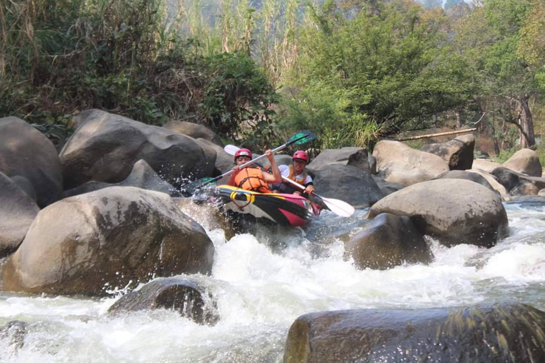 เนื่องจากช่วงเดือนกุมภาพันธ์น้ำน้อยนะครับเลยไม่ได้ใช้เรือยางลำใหญ่ ได้ใช้ลำเล็กระหว่างทางธรรมชาติสวยมากบ้านเรือนคนก็แบบท้องถิ่นมีช้างอาบน้ำอยู่ตามข้างทางที่ไปเจอหลายเชือกมากบอกได้คำเดียวความรู้สึกตอนนั้นคือฟินได้ดื่มด่ำกับความงามของสองข้างทาง หลังจากล่องแก่งเสร็จผ่านไปเกือบสองชั่วโมงเราก็พักทานข้าวกันครับมีพัดไท มีผลไม้ ครับไม่อิ่มก็เติมได้ดีมากๆ เสร็จแล้วราก็ไปเดินป่ากันครับระหว่างทางไกด์ก็พาเราทำกิจกรรมไปเรื่อยๆดูต้นไม้ใบหญ้าลองกินลองดมของแปลกๆในป่า ได้ฟิวมาหครับ ชอบๆ เดินไปเรื่อยๆเหนื่อยเอาเรื่องอยู่นะครับ เดินไปจนถึงน้ำตก ขอโทษด้วยนะครับไปตัวป่าวไม่ได้หยิบโทรสับ ไม่ได้หยิบกล้องมาด้วย เลยไม่ได้ถ่ายรูปให้ดูเลย พอถึงน้ำตกไกด์ให้เวลาเล่มน้ำตกสักพักนึงครับ มีสไลเดอร์จากธรรมชาติด้วยนั่นก็คือโคดหินใหญ่ๆลื่นลงมาใบบ่อน้ำลึกประมาณ 2 เมตรกว่า ส่วนความสูงของหินนั้นไม่ต้องพูดถึง สูงมาก ถึงกับขาสั่นเลยครับ แต่ได้ลองเล่นแล้วถึงกับติดใจต้องไปลองกันนะครับสนุกมาก เื่อเล่นเสร็จอะไรเสร็จก็อาบน้ำเปลี่ยนชุดกลับตัวเมืองเชียงใหม่ครับ