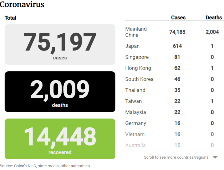 19/02/2020 ...........ยอดผู้เสียชีวิต 2009 ..........ผู้ป่วย เพิ่มเป็น 75197 ................... ยอดผู้หายป่วยเป็นปรกติ 14448