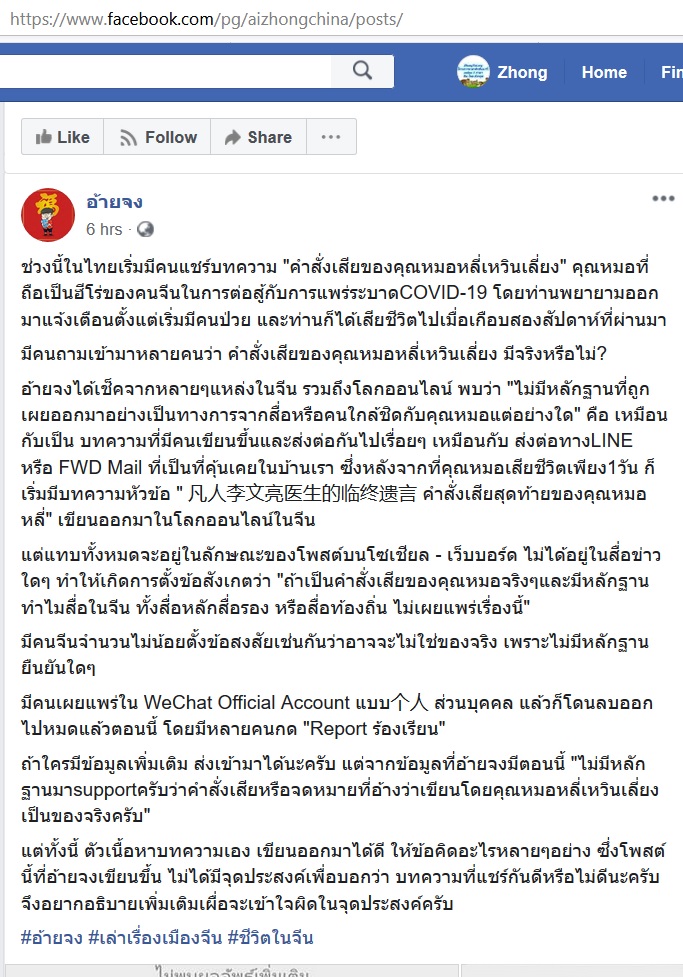 5.เพจภาษาไทยที่นำเสนอเรื่องเกี่ยวกับจีนก็บอกว่ายังไม่มีหลักฐาน
