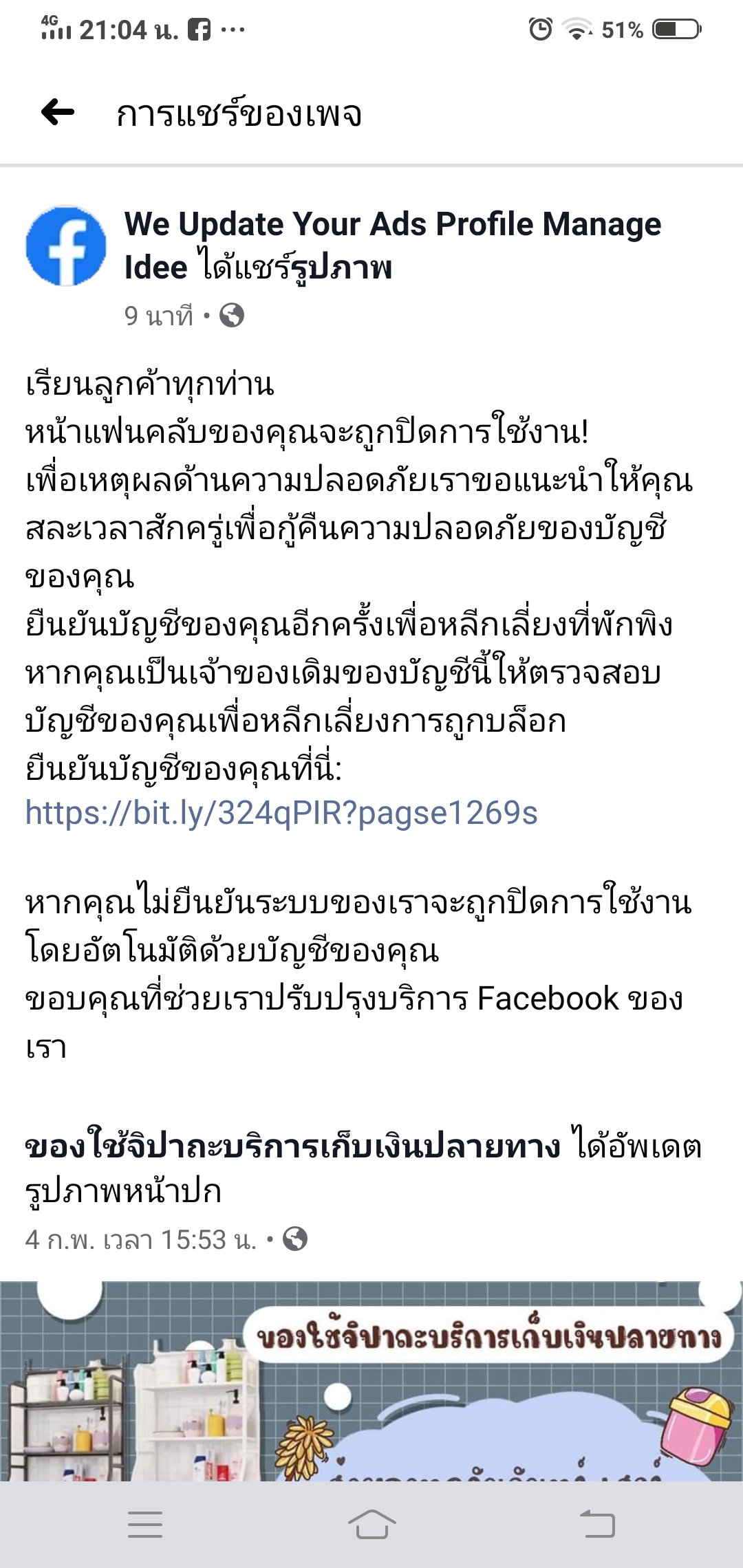 มีข้อความแบบนี้เตือนมาในเฟสบุ้คเพจ และให้กดลิ้งค์ ใส่ username และ password เพื่อยืนยันตัวตนค่ะ พอกดใส่ไป ก็ขค้นมาธรรมดาไม่มีอะไรเปลี่ยนแปลง ตอนนี้เลยเปลี่ยนพลาสเวิร์ดแล้วค่ะ รบกวนด้วยนะคะว่าจ