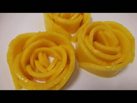หลังจากนั้นก็ให้เรานำมะม่วงชิ้นที่เล็กที่สุดมาม้วนลงบนจานเป็นลักษณะของเกสรกุหลาบ