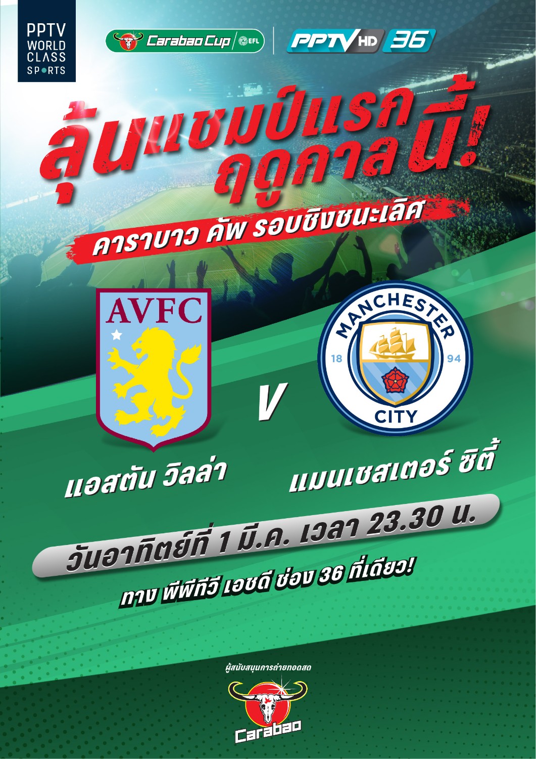 แชมป์ถ้วยแรกของฤดูกาลนี้ ใครจะประเดิมคว้าไปครอง แฟนบอลเตรียมร่วมเป็นสักขีพยานผ่านการถ่ายทอดสด “คาราบาว คัพ 2019/20 รอบชิงชนะเลิศ” ในคืนวันอาทิตย์ที่ 1 มี.ค. นี้ ตั้งแต่เวลา 23.30 น. เป็นต้นไป ทาง พีพีทีวี เอชดี ช่อง 36 ที่เดียว