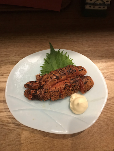 ถึงร้านแถวโรงน้ำชาจะปิดไปแล้วบ้าง เราก็หาอะไรทานจนได้ เป็นร้านที่อยู่ริมถนน สไตล์ญี่ปุ่น มีเคาเตอร์บาร์ ในร้านสามารถสูบบุหรี่ได้ มีชาร์ทเพิ่มคนละ 500yen ไม่รวมค่าอาหาร มื้อนี้ก็หมดไปหลายพันเยน อาหารก็ญี่ปุ่นสุดๆ >.<