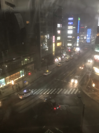 เมื่อถึง Kanazawa คือหนาวมากกก ก.ไก่ล้านตัว ออกจากสถานีเดินออกมานี่ คือ ควันออกปากเลยแหล่ะ น่าจะน้อยกว่า 10 องศา ก็ลากกระเป๋าเดินไปโรงแรมที่พัก ที่พักก็ไม่ได้ไกลจากสถานีนัก แต่ด้วยที่ว่า เท้าเริ่มเจ็บ เลยทำให้เดินได้ช้า เช็คอินตอนนั้นก็เวลา 4 โมงกว่าได้แล้ว หลังจากเช็คอินเสร็จ ก็ตกลงกันว่า จะมาเดินเล่นแค่แถวโรงน้ำชา (Higashi Chaya) ก็เลยนั่งรถบัสมาลง บรรยากาศก็ค่ำๆแล้ว เมืองเงียบๆ ร้านปิดกันเกือบหมดแล้ว เดินละแวกนั้นก็มีฝนตกหน่อยๆ ตอนแรกก็ฝนนะ ไปๆมาๆ เป็น Snowflake จ้า คือตื่นเต้นมาก ไม่เคยเจอ เลยถ่ายรูปเก็บไว้ 555