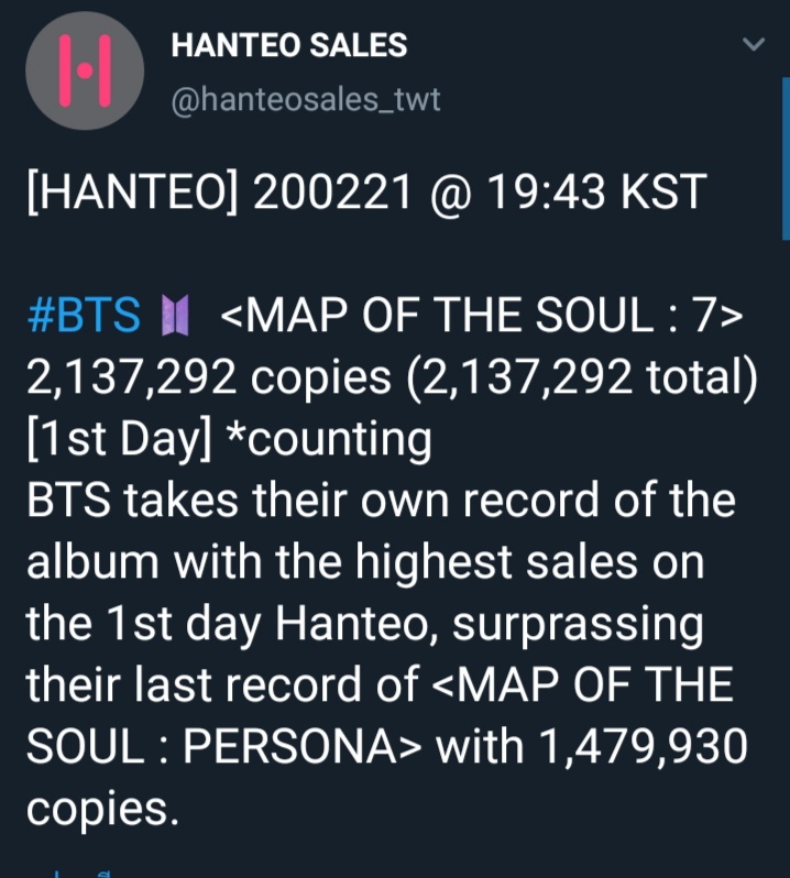 [ #BTS ] อัลบั้ม MAP OF THE SOUL: 7 ทำยอดขายทะลุ 2 ล้าน (2,137,292 Copies) ใน 1ชม.43 นาที !